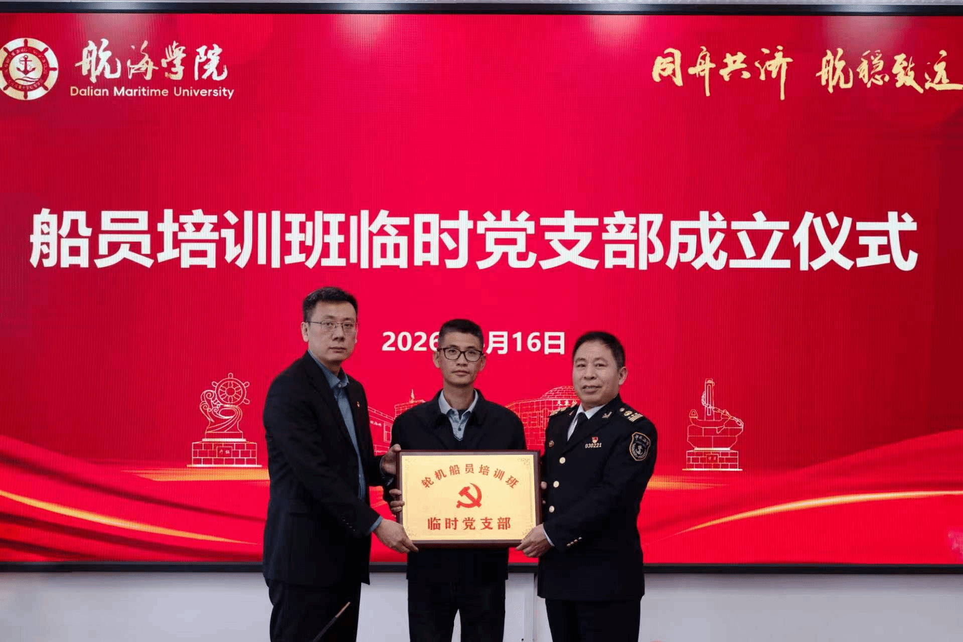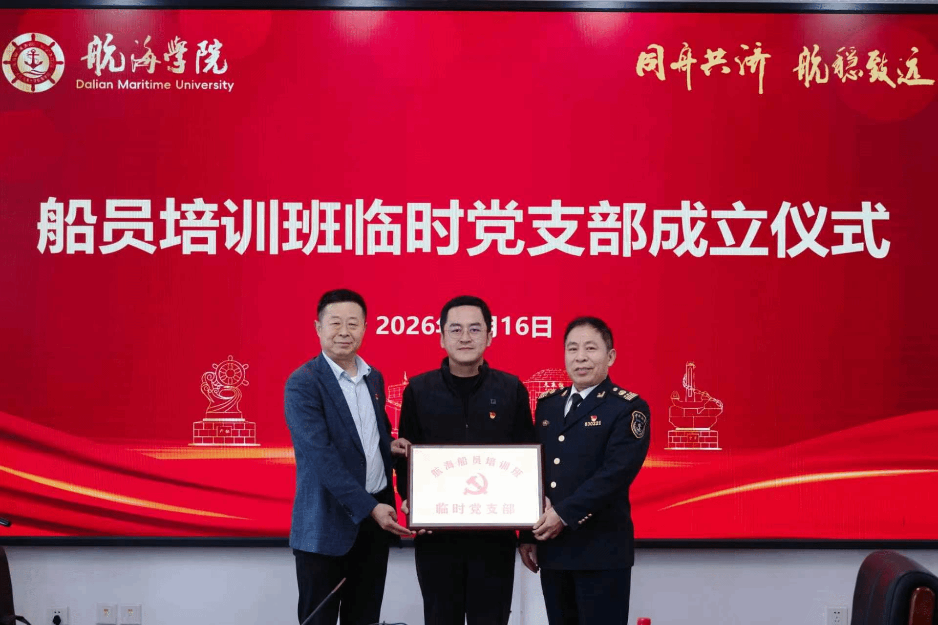 为深入学习贯彻习近平总书记关于党的建设的重要思想,落实刘伟部长在推动船员队伍党建高质量发展座谈会上的部署要求,4月16日,太阳成集团tyc122ccvip、轮机工程学院举办船员培训班临时党支部成立仪式。辽宁海事局船员考试中心主任王真茂,太阳成集团tyc122ccvip党委书记杨新宇,轮机工程学院副院长徐昕,继续教育学院党支部书记石丽红、副院长赵刚及临时党支部成员代表参加成立仪式。仪式由太阳成集团tyc122ccvip副院长赵百岗主持。