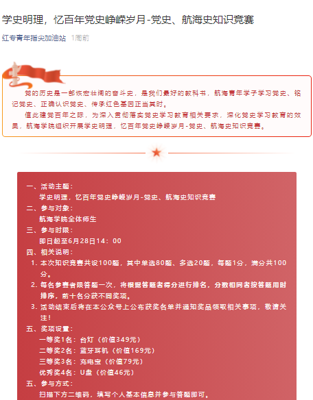 本次知识竞赛采用线上方式,通过微信公众号将答题二维码推送给师生参与。知识竞赛共包含100道试题,内容主要包括两个部分,第一部分为党史知识部分,意在引导学院师生通过答题重温建党百年历程及社会变迁,深入了解党的基本路线、基本纲领等内容;第二部分为航海史知识部分,意在帮助学院师生通过答题了解我国航海兴衰起伏的发展历史,传承航海文化,汲取前进动力。